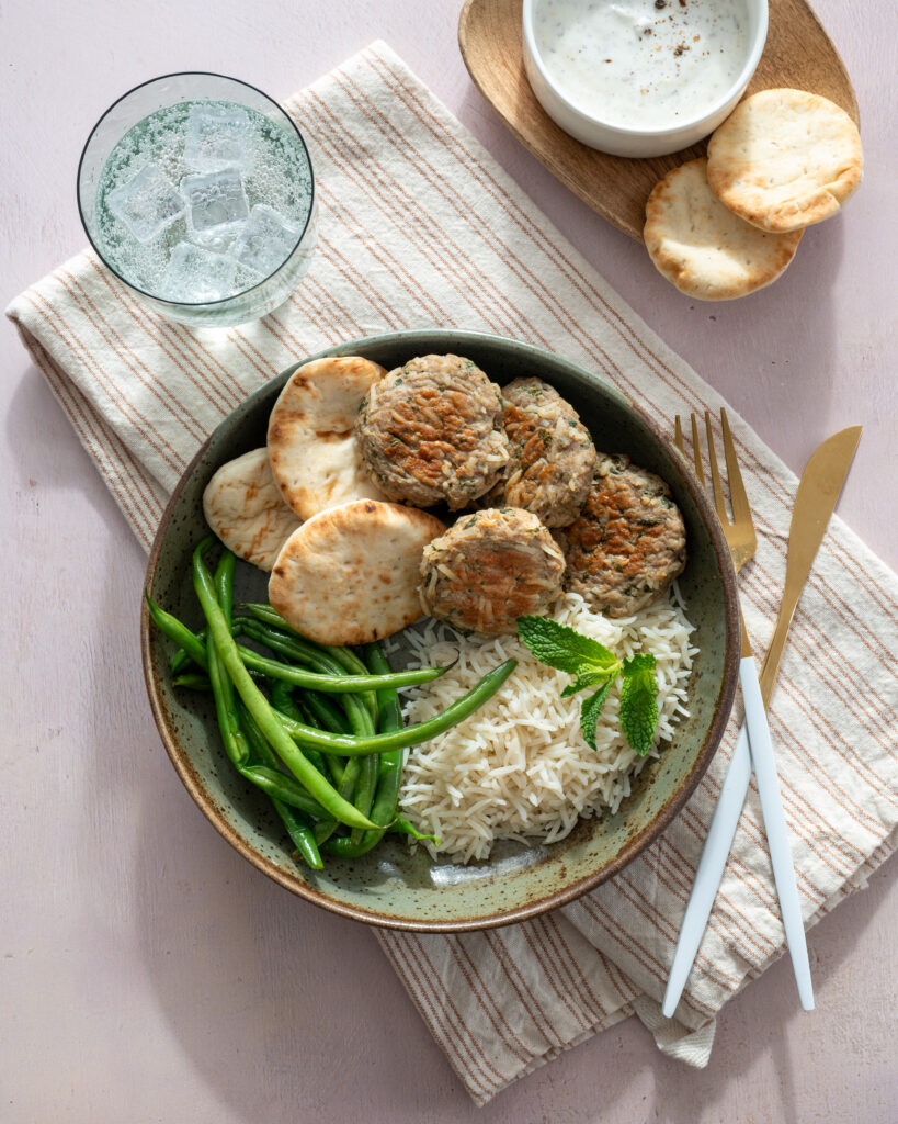 Boulettes de keftas au poule dans une assiette verte et accompagnés de riz blanc, de haricots verts et de mini pains naan