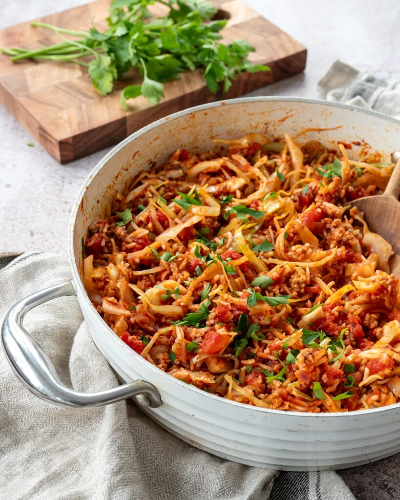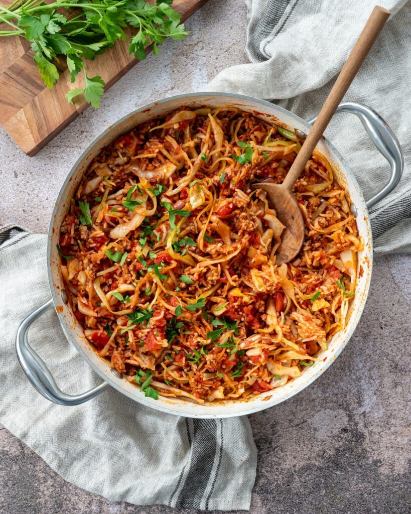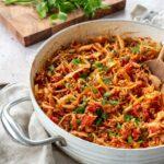 Côté viande, j’ai utilisé du porc, mais n’importe quelle viande hachée que vous avez sous la main fera très bien l’affaire. Au départ, je pensais mettre le bacon facultatif, mais il apporte tellement une belle touche fumée qu’il a gagné sa place dans la version finale. Pour la garniture, j’ai ajouté du persil frais. Si vous en avez, ne vous gênez surtout pas pour en mettre généreusement. Ça apporte une fraîcheur incroyable et ça rehausse si bien la saveur du plat. D’ailleurs, l’utilisation des épices et des herbes fraîches est une belle stratégie pour réduire le sel ajouté à nos plats.