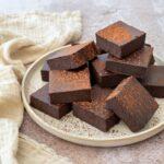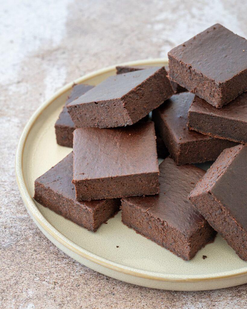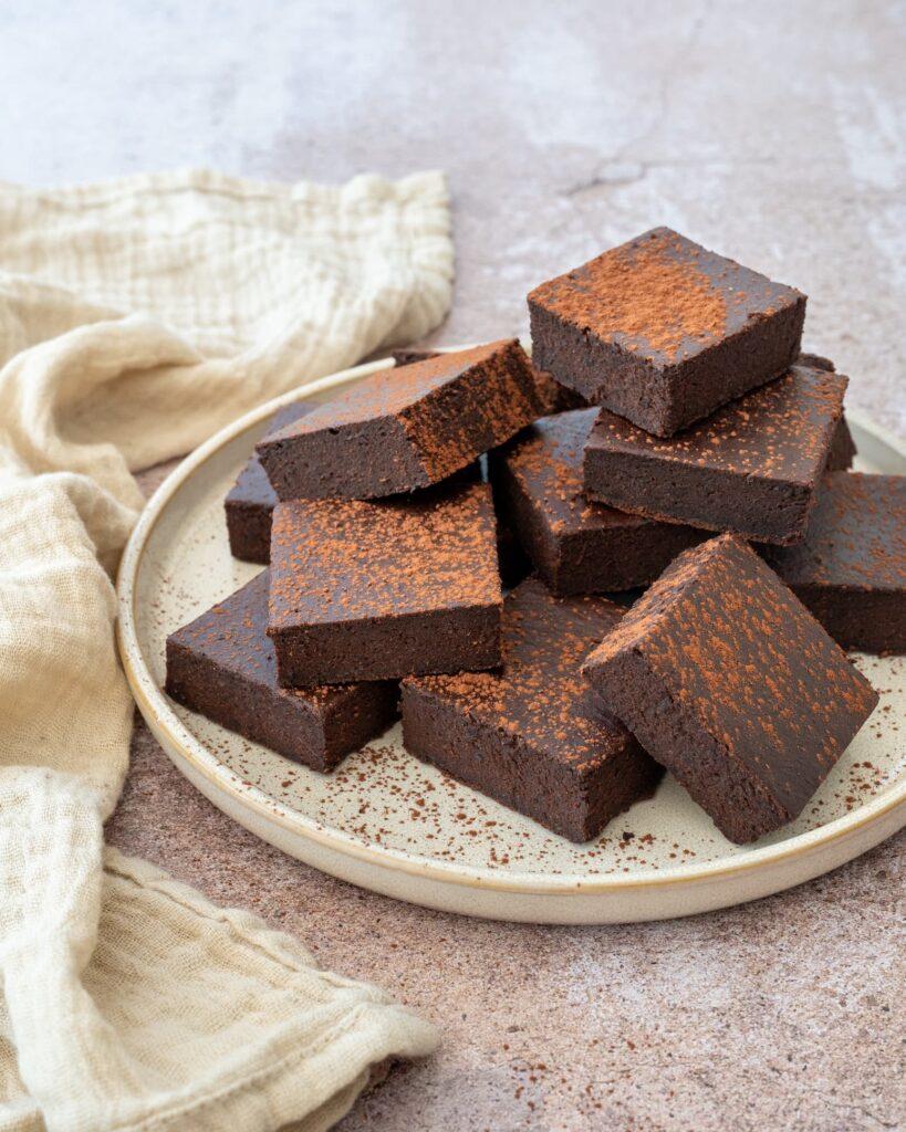 Décadent gâteau de style brownies coupés en carrés, déposés dans une assiette et saupoudrés de cacao