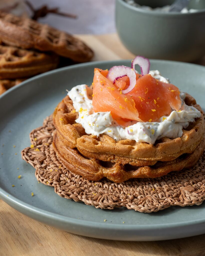Mais ma façon préférée consiste à tartiner les gaufres de fromage à la crème fouetté au romarin et à déposer du saumon fumé sur le dessus. Un vrai D-É-L-I-C-E en bouche ! Quand j’ai goûté à cette combinaison, j’ai presque tout mangé… et il ne restait qu’un petit morceau pour que Josiane, ma stagiaire en nutrition, puisse y goûter (hihi!). Et la polyvalence ne s’arrête pas là : utilisez ces gaufres pour faire des sandwichs gourmands. Une façon originale de jazzer un sandwich au poulet ou au thon.
