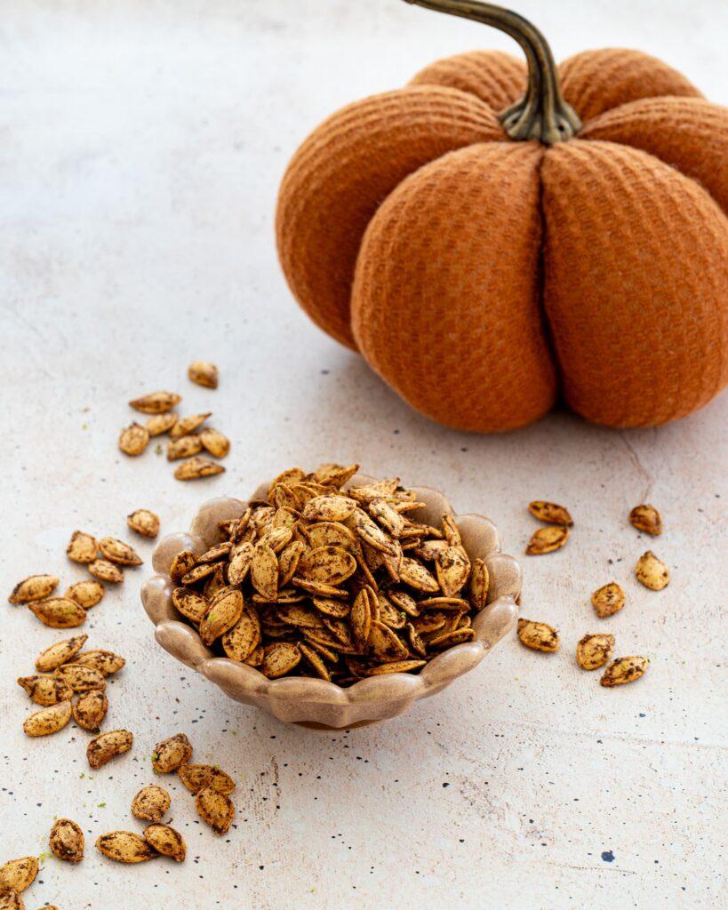 - Dans un bol, mélanger les assaisonnements. Ajouter les graines de citrouille et bien mélanger.