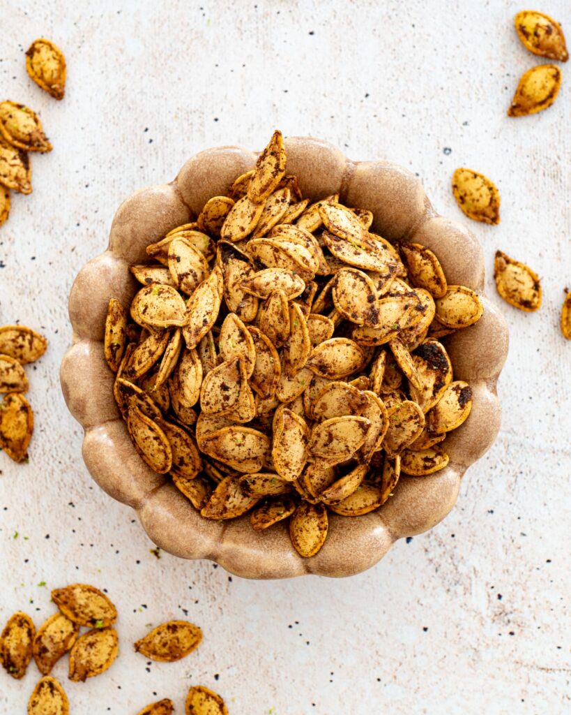 Ces graines de citrouille chili-lime sont un snack irrésistible qui combine croquant, chaleur du chili et fraîcheur de la lime. En prime, c’est une recette anti-gaspillage! Riches en protéines végétales, fibres et minéraux, elles constituent un en-cas sain et rassasiant, parfait pour remplacer les options industrielles. Polyvalentes, les graines de citrouille cuisinées se dégustent seules ou se glissent facilement dans les salades ou comme garniture sur les potages.