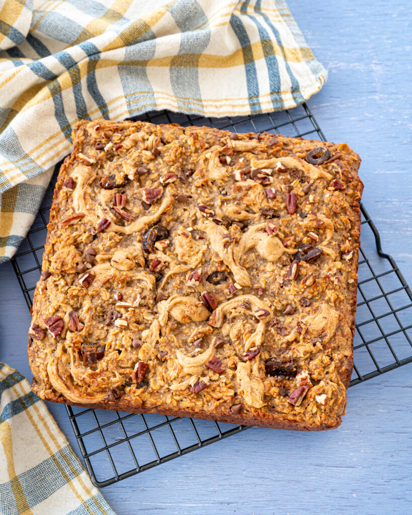 - Ajouter le beurre d’arachide restant et faire un effet marbré sur le dessus. Si désiré, parsemer de pacanes.