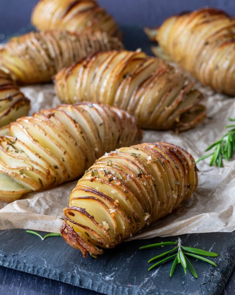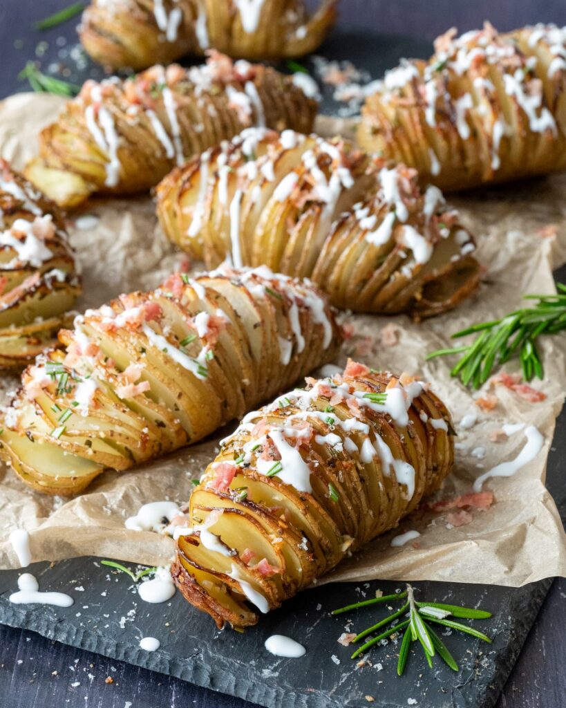 Pour cette recette, je vous propose une version au miel, romarin, bacon et parmesan, mais les pommes de terre Hasselback se prêtent vraiment à toutes sortes de déclinaisons gourmandes. Vous pouvez, par exemple, remplacer le parmesan par du fromage bleu, du feta, du cheddar ou même un mélange de vos fromages préférés. Une petite sauce yogourt et citron pourrait aussi être délicieuse pour ajouter une petite touche de fraîcheur!