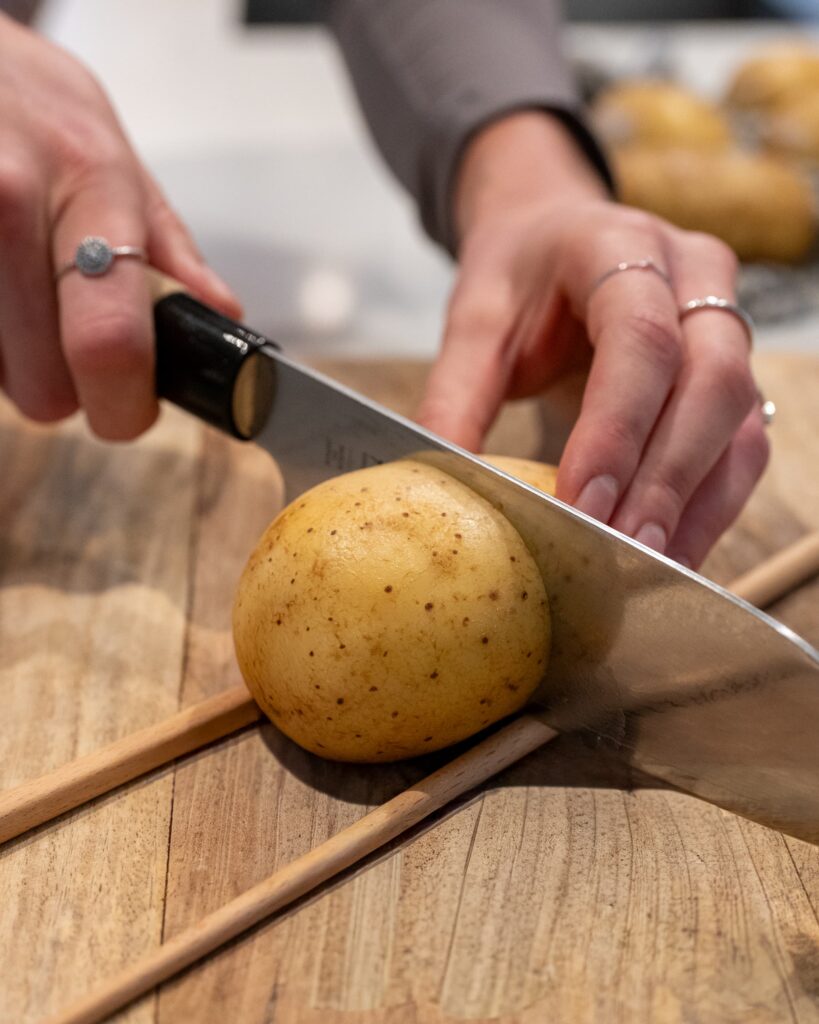 - À l’aide d’un couteau tranchant, faire de fines incisions (environ 2 mm de largeur) dans les pommes de terre sans les trancher complètement. Voir l’explication ci-haut.