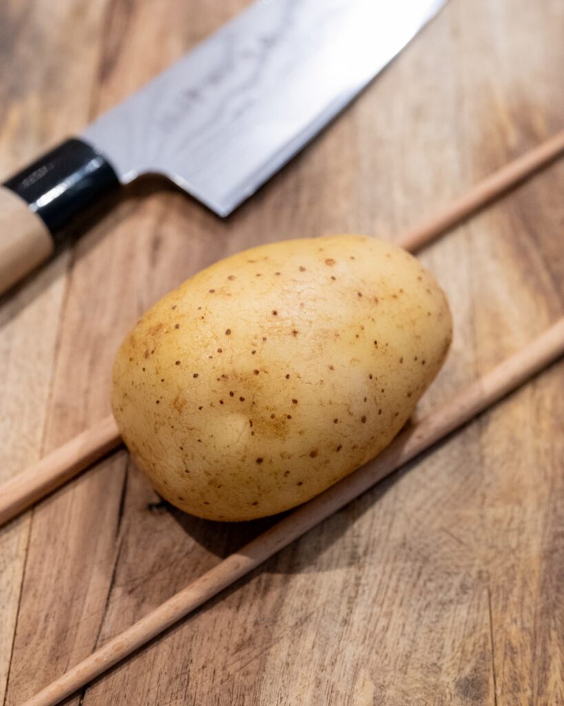 Mon astuce : utiliser une paire de baguettes à sushi! Pour réussir de belles incisions sans couper la pomme de terre de bord en bord, placez une baguette de chaque côté (Voir la photo #1). Coupez ensuite jusqu’à ce que votre couteau touche les baguettes (Voir la photo #2). Cette petite astuce vous permettra d’obtenir de jolies tranches régulières qui absorberont parfaitement le mélange de beurre, d’huile et d’épices. C’est ce qui rend cette recette si goûteuse et savoureuse!