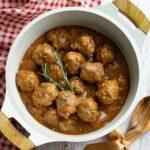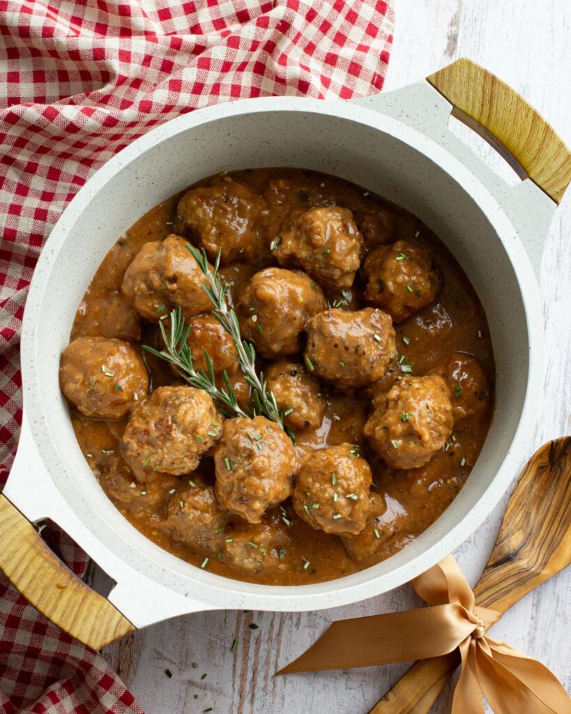 Pour cette version, j’ai ajouté de la sauge et du romarin frais afin de rehausser les saveurs et d’apporter une touche plus festive au plat. Ces herbes se marient très bien avec le bouillon de bœuf et les boulettes, sans voler la vedette aux saveurs traditionnelles. J’ai aussi glissé une branche de sauge fraîche directement dans le bouillon pendant la cuisson. Vous pourriez tout aussi bien utiliser une branche de romarin, ou même combiner les deux, selon ce que vous avez sous la main et vos préférences..
