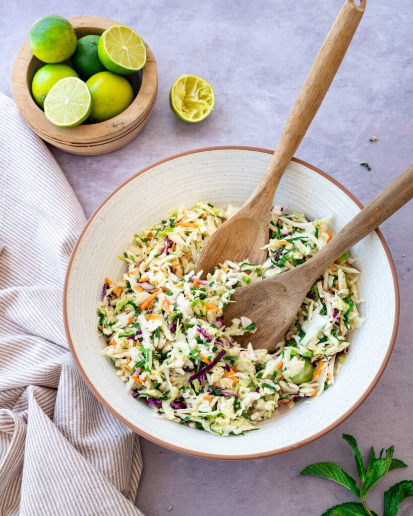 J’ai créé cette recette de salade de chou à la menthe, miel et lime pour un brunch de Pâques avec ma famille. Je l’ai tellement aimé que je devais la refaire pour vous l’offrir! C’est une recette hyper savoureuse et rafraîchissante qui se prépare en 10 minutes. Pour que ce soit le plus simple et le plus rapide possible, j’utilise un sac de salade de chou du commerce. Un produit peu dispendieux qui contient du chou vert, du chou rouge et des carottes. Perso, j’adore ces mélanges!