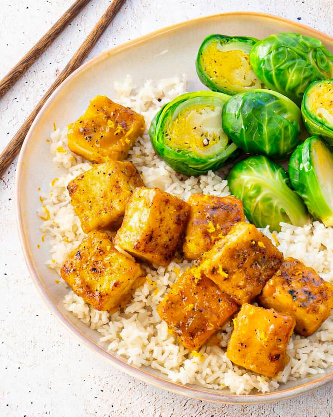 Cubes de tofu à l'orange accompagnés de riz et de choux de Bruxelles déposés dans une assiette beige