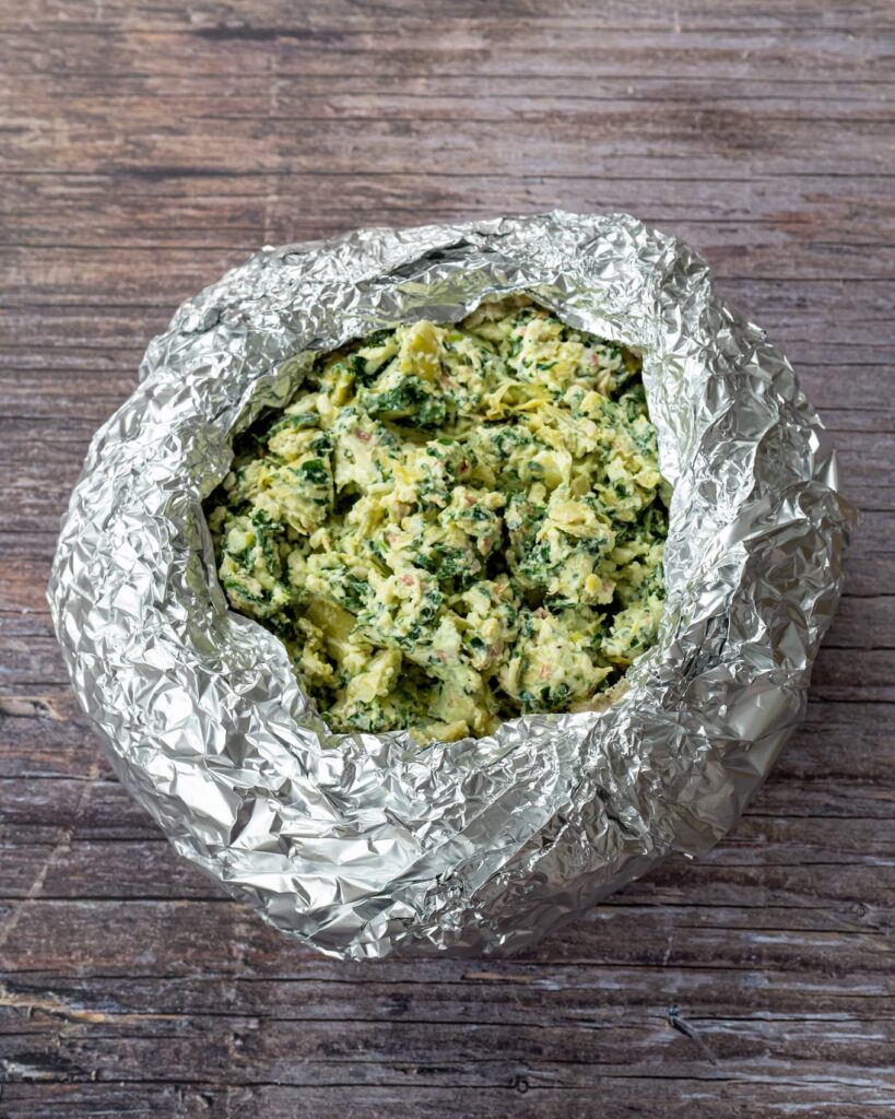 Il existe plusieurs façons de cuire une miche farcie, mais on voulait une technique simple, efficace et qui garde le pain tendre tout en laissant la trempette bien gratiner. Notre solution? Habiller la miche d’un grand papier d’aluminium comme si vous lui mettiez un petit chapeau de douche, lol! Couvrez bien les côtés, mais laissez le dessus ouvert. Ça protège la miche lors de la cuisson tout en permettant à la garniture de dorer et de devenir crémeuse.