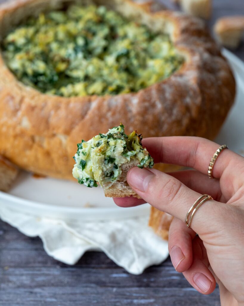 Quelle réussite! On s’est amusées à la rendre bien généreuse avec deux types de fromage et un peu de bacon pour la touche gourmande. La recette contient aussi un beau trio vert avec les artichauts, les épinards et le chou kale. Vous pouvez d’ailleurs l’adapter comme vous le souhaitez : seulement épinards, seulement chou kale, ou un mélange des deux comme nous l’avons fait. Servie dans une miche croustillante, cette trempette fera fondre de plaisir tout le monde autour de la table. C’est le genre d’entrée parfaite pour recevoir, pour un apéro festif ou pour un souper entre amis où l’on veut impressionner sans se casser la tête.