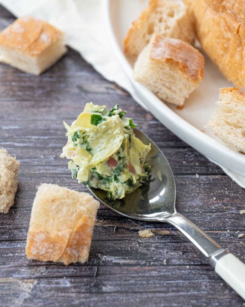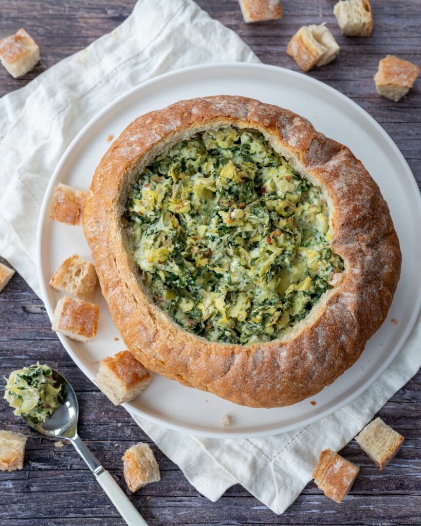 J’ai développé cette recette avec Rosalie, ma stagiaire en nutrition de l’Université de Montréal. Dès qu’on a commencé à travailler ensemble, elle me parlait de ce type d’entrée avec l’eau à la bouche : une miche chaude remplie d’une trempette crémeuse. Alors, je n’avais pas d’autres choix… Nous devions créer notre propre version de cette classique trempette aux artichauts!